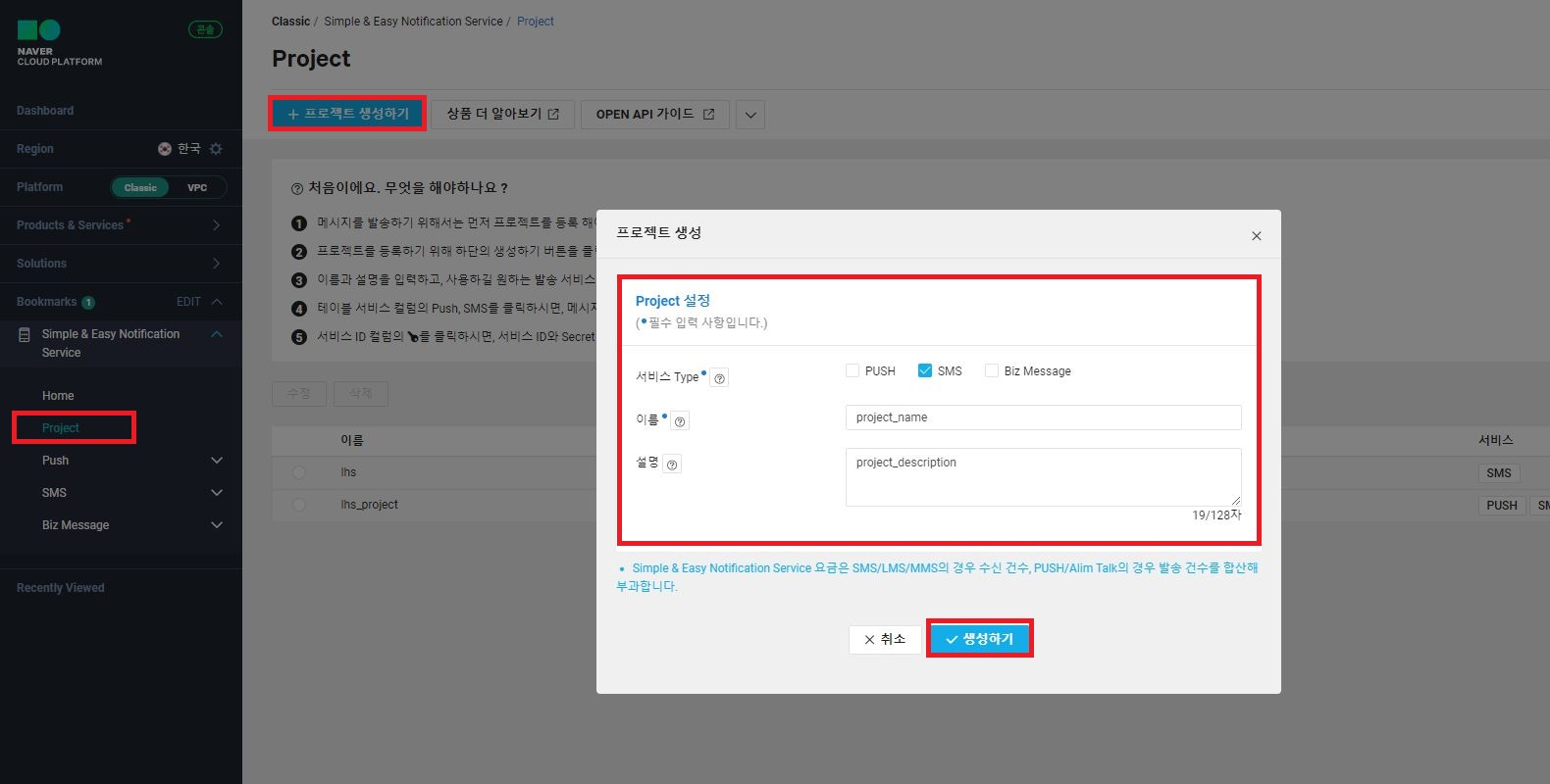 4. Simple & Easy Notification Service -> Project -> 프로젝트 생성하기