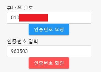 휴대폰 번호 입력 후 인증번호 요청 누르면 -> 인증번호 입력창과 확인 버튼이 생긴다.